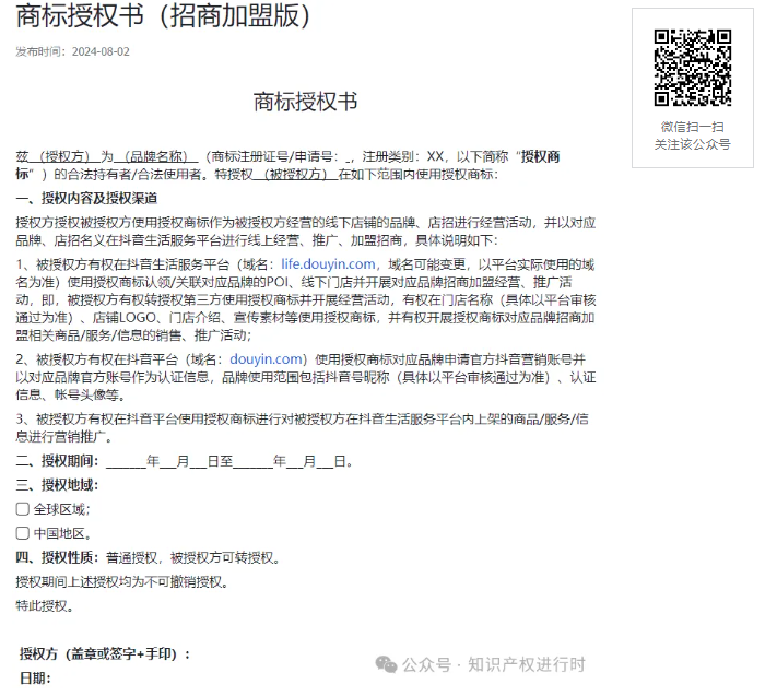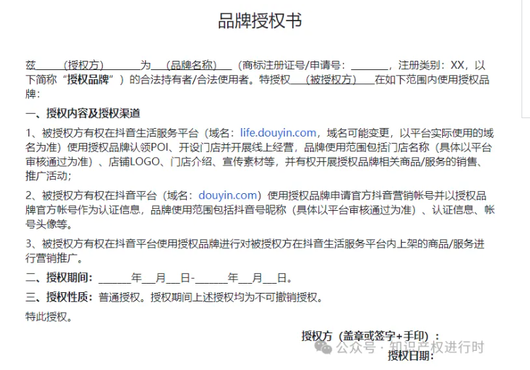 现在抖音商家中,也有很多是通过品牌加盟或者直播带货的形式,对于这类商家,只有通过商标权利人进行品牌授权。同时,抖音也提供了商标授权的模板!